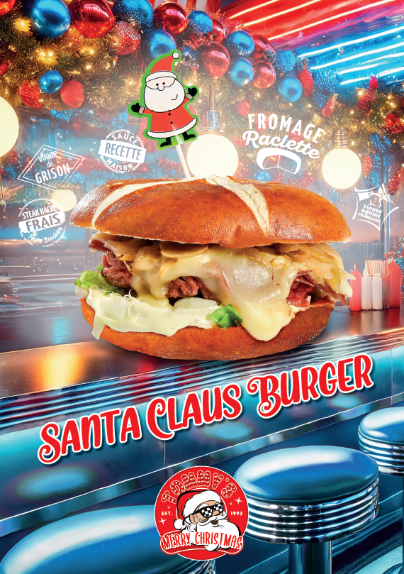 Régalez-vous avec notre Santa Claus Hot Dog : pain hot dog boulanger artisanal, saucisse Nathan’s pur bœuf, sauce Blue Cheese (Recette Maison), oignons grillés caramélisés, fromage à raclette,viande de grison et lardons…