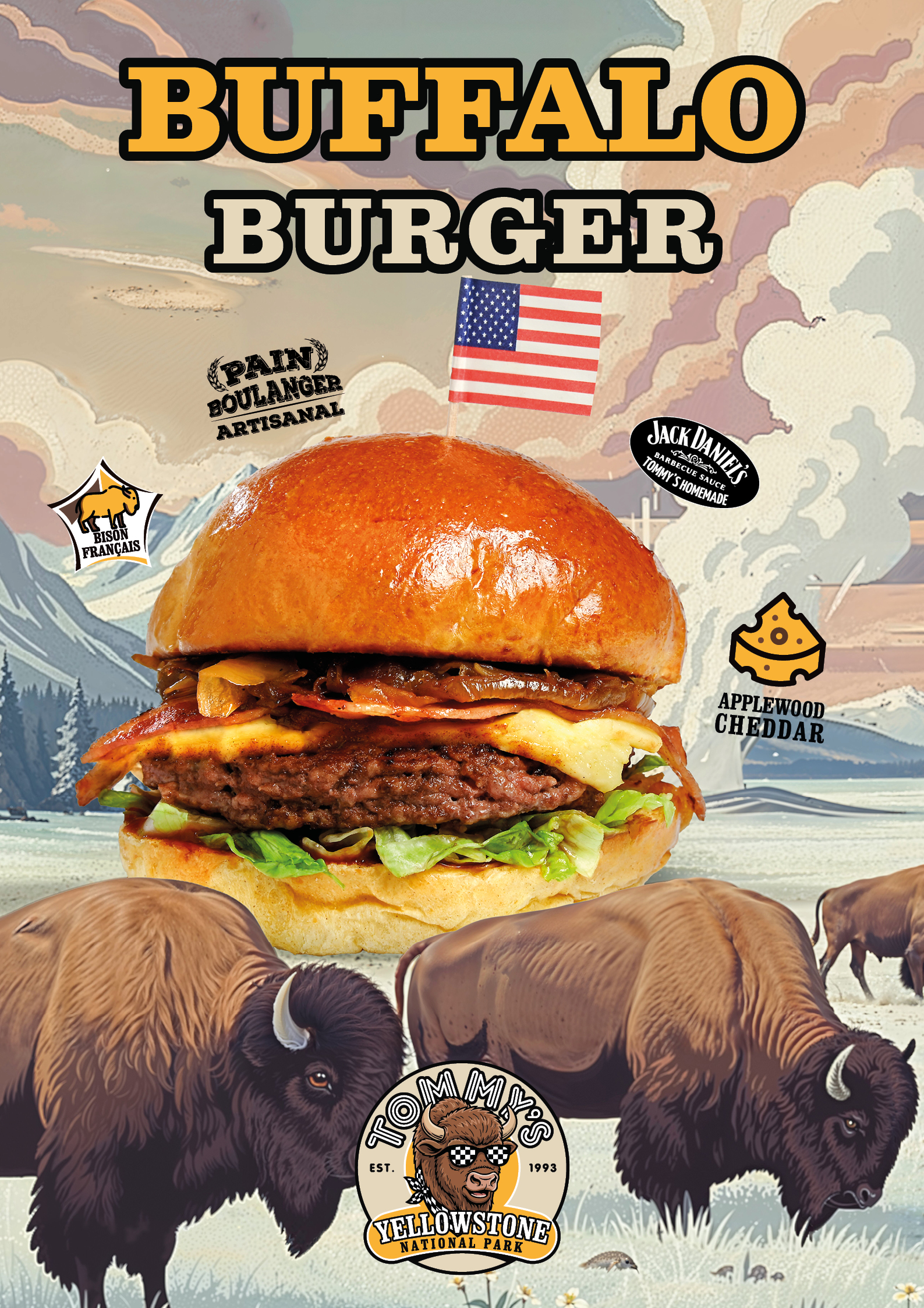Un burger de caractère à la viande de bison français (oui, oui !) inspiré des grandes plaines de l’Ouest : généreux, rustique et résolument US.